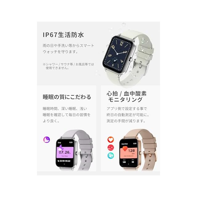 【主要機能】「メッセージ/着信通知(対応済みアプリ:LINE/着信/SMS/Facebook/X(Twitter)/Instagram/WhatsApp/WeChat/Skype/KaKaoTalk/QQ」「AMOLED常時表示ディスプレイ」「メッセージ/着信通知」「通話」「連絡先保存」「音声アシスタント」「ステップ数」「消費カロリー」「睡眠記録」「スポーツ測定」「天気予報」「音楽操作」「生理周期管理」「遠隔撮影」「ストップウォッチ」「タイマー」「アラーム」「計算機」「腕振り点灯」「スマートフォンを探す」「呼吸エクササイズ(リラックス)」「壁紙変更」「明るさ調整」「世界時計」「座りがち通知」他