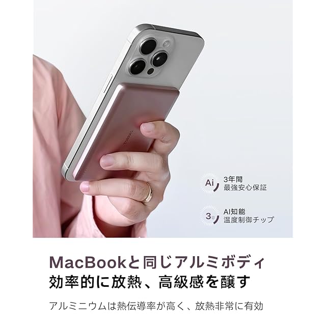 商品名:TORRAS モバイル バッテリー 超薄型 MagSafe対応 マグネット式 ワイヤレス充電器 軽量 かわいい マグセーフ 急速充電 5000mAh iPhone12~17対応 プレゼント/旅行/出張(バラ色)