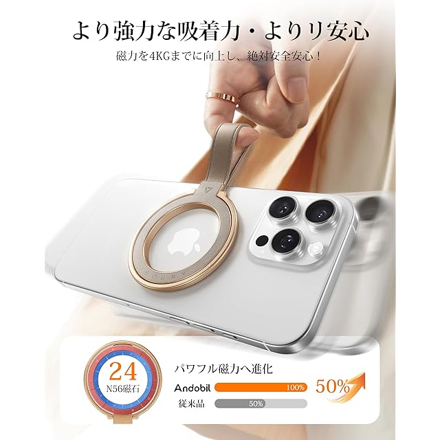 【吸着力4KG・より強力な磁力、より高い安心感】スマホの安全性もAndobilが重視しています。Andobilのプロダクトマネージャーは、磁力をより強化することで、お客様が使用する際の安心感を向上させることを考えました。数百回の実験の結果、この小型のマグセーフ リングに4kgの磁力を実現しました。まず、MagStand Proでは磁石の中でも最も強力な「N56ネオジム」を使用しています。さらに、製品内部の磁石の配置を最適化し、この小さなバンカーリングに最大24個の磁石を収めることに成功しました。最後に、製品の背面にはシリコンを追加し、摩擦力と吸着力を強化するだけでなく、携帯リングを使用する際にスマホが傷つけられる心配がないため、快適にご利用いただけます。また、MagSafe対応のケースであれば、iPhone 17/16/15/14/13/12シリーズでもケースをつけたまま使用できます。
