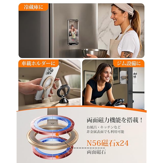 【ユーザーに大人気・両面マグネット機能】当社の製品MagRing Proは、その両面マグネット機能がユーザーに大変好評をいただいており、MagStand Proでも同様の機能を引き継いでいます。お客様は両面磁気吸着機能を使用して、車載ホルダーや冷蔵庫、洗濯機、ジムの設備など、磁力のあるものに製品を取り付けることができます。また、キッチンやお風呂の壁など磁力のないものには、付属のメタルリングを貼り付けることで磁力を持たせることも可能です。この両面マグネットで、いつでもどこでも両手を解放して、TikTokやYouTube、Instagramなどのアプリを自由に楽しむことができます。