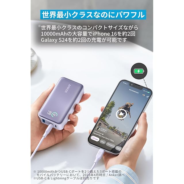 世界最小クラスなのにパワフル : 世界最小クラス (※) のコンパクトサイズながら10000mAhの大容量で、iPhone 16を約2回、Galaxy S23を約2回充電が可能です (※10000mAhかつUSB-Cポートを2つ備えた3ポート搭載のモバイルバッテリーにおいて、2023年4月時点 / Anker調べ) 。