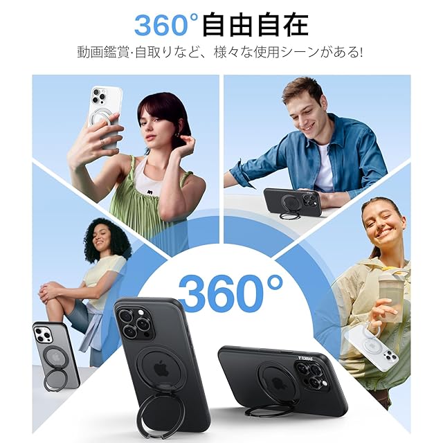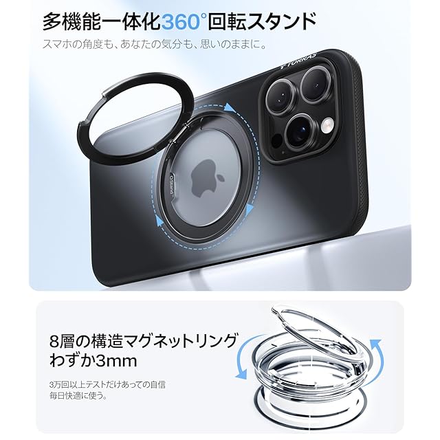 商品名:TORRAS iPhone 15 Pro 用 ケース【チクチク・多機能360度回転スタンド】 縦横両対応 マグネット搭載 MagSafe対応 米軍規格耐衝撃 リング 指紋防止 黄変防止 マグセーフ対応 レンズ保護 手持ち撮影 安定性 三眼 6.1インチ「Ostand R Fitness」ブラック