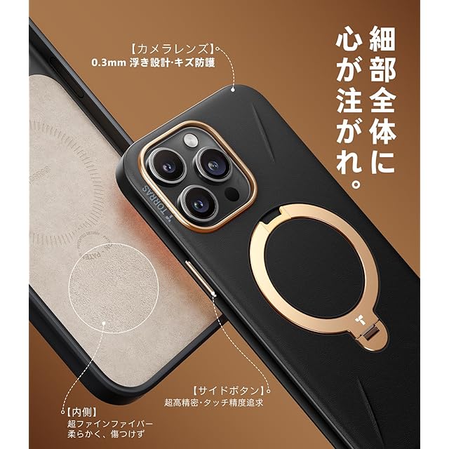 商品名:【新感覚レザー・スキンタッチ】TORRAS iPhone 15 Pro 用 ケース 革 360°回転スタンド 縦横両対応 リング マグネット搭載 MagSafe対応 ワイヤレス充電対応 米軍規格耐衝撃 指紋防止 黄変防止 Ostand Q3 レザートーン こくよう・ブラック