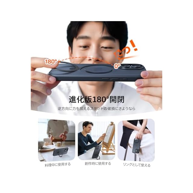 【耐久性・安定性を両立したスタンド】Ostand Q1 Guardian は、金属ギア構造により確かなロック感を生み出し、航空級アルミニウムを採用し、5000 回以上の開閉試験と耐衝撃試験をクリアした耐久性で長時間の使用でも安心で、何度も角度の微調てもうっかりした衝撃でもズレや鈍りが生じない。そして、定点スタンドとして、スタンドケースの中で最も安定している存在で、集中作業でも、レポート作成中でも傾けてiphone 17 を立ても、スタンドの揺れが一切なし。さらに、スタンドは閉じた状態で本体にぴったりフィットし、まるで存在しないかのように隠れ、iphone 17 本来の握り心地を楽しめます。対応機種:iPhone 17 ケース リング