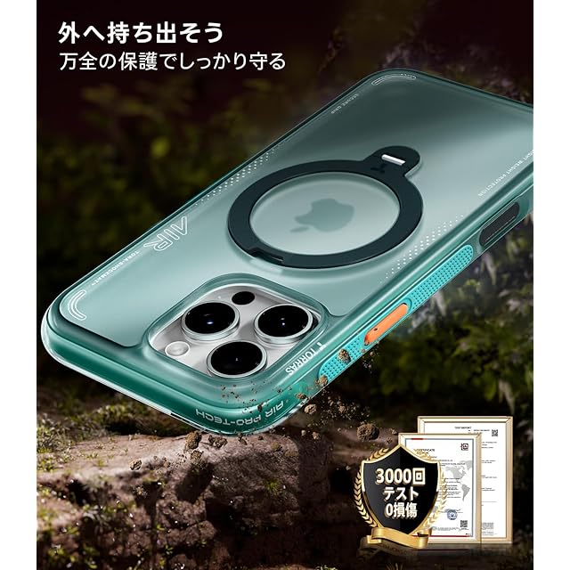 【見える最強防御!Air クッション搭載】 世界初の エアクッション 技術を搭載、100% 空気力学構造が 落下・衝突・摩擦を瞬時に分散吸収!米軍規格 4m耐落下防護性。 4m 高さから 100 回落下しても亀裂を生じにくい。-20℃~60℃の温度変化や湿度 95% 環境下でも材質劣化せず、3段階衝撃緩和メカニズム:まず初期衝撃吸収:スマホ枠の上下エアバッグが最初の衝撃波を緩衝、次にエネルギー分散:エアクッション層が衝撃力を周囲に拡散、最後に最終防護:強化フレームが残留エネルギーをブロック。満員電車でバッグから滑落、デスクワーク中のうっかり滑り、お子様の嬉しいはずみでの誤落下はもちろん、山道ハイキングでのポケットからの飛び出し、サイクリング中の激しい振動… どんなアクシデントでも、フチを1.44mm わずかに高く設計。 特にアウトドアでの使用時は、石や地面との接触による衝撃もしっかり吸収し、冒険中も安心してスマホを使えます。目で見える全方位保護で、いつも安心感をパックしています。(対応機種iPhone 16 pro Max)