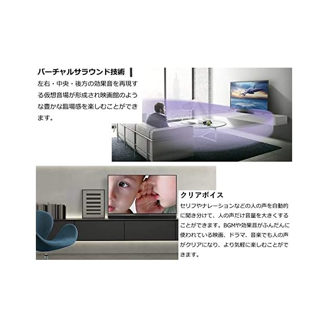「クリアボイス」や「バスエクステンション」、ヤマハ独自チューニングのサラウンド技術によりテレビの音を聴きやすくグレードアップし、サイズを超えた豊かな低音と臨場感を再現