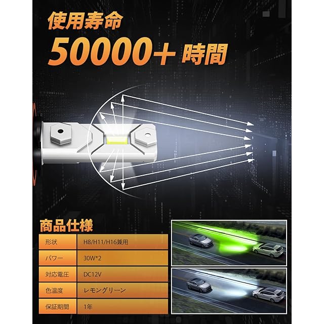 【視認性が抜群】BORDAN社の フォグランプ led h8 レモンイエロー光は波長が長く、冬場や雨、雪、霧などの状況に適しており、夜間は快適な運転ができ、また完璧な貫通性能を発揮することもできます。人間の目で見ても運転手にとっても非常に容認しやすいのですが、疲れません。また、h8 led フォグ ライムグリーンは特別な光色でおしゃれ性も感じられます。※ご注意:製品の明るさは取り付けられる車両により異なります。