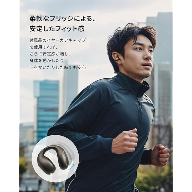 装着しやすい柔軟なブリッジによる、安定したフィット感:付属品のイヤーカフキャップを使用すれば、さらに安定感が増し、身体を動かしたり汗をかいたりした時でも安心。