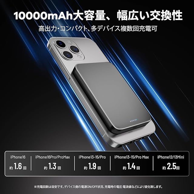 【業界最強磁力、軽く貼るだけで即充電】Catmart のマグネット式ワイヤレスモバイルバッテリーには18個のN52級強力磁石が内蔵され、軽く貼るだけでしっかりと吸着できます。市販品より15倍も強い磁力を持ち、位置ずれによる充電不能という普通のワイヤレス充電の弱点を効果的に克服し、バッグやポケットに入れても安定して充電できます。iPhoneと一緒にMagsafe充電を手に持って行うことができるため、ケーブルが不要で有線充電の煩わしさを解消します。※ご注意:本製品のマグセーフ充電機能は、Magsafe対応のスマートフォンなどのデバイスおよび磁石式ワイヤレス充電に対応する場合のみ使用可能です。