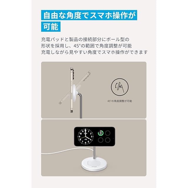 自由な角度でスマホ操作:充電パッドと製品の接続部分にボール型の形状を採用し、45°の範囲で角度調整が可能。充電しながら見やすい角度でスマホ操作ができます。