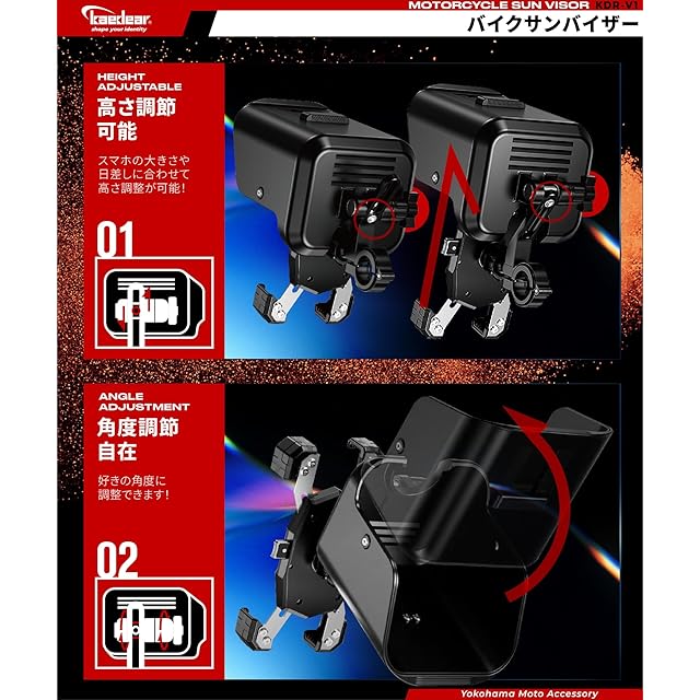 【日除けや雨除けとして】 夏のツーリングでは太陽光による熱の影響とスクリーンの明るさ最大状態による発熱により、 スマホの温度プロテクションが作動してスマホが使用できなくなります。 サンシェードで日陰を作り、画面の明るさを下げる事でスマホの温度上昇を軽減します。雨のツーリングではスマホのスクリーンに付着する雨粒により、画面操作ができなくなったり誤作動を引き起こします。サンバイザーが雨を避けスマホの操作性を維持します。 ご注意:⑴効果を発揮するために最低限必要なサイズとなります。思ったよりもサンバイザーが大きく、メーターが見えづらいなどの障害が発生する可能性があります。⑵重量が増すため、クランプバーの強度により振動で振れやすくなったり、折損する可能性があります。対応品番KDR-H3/KDR-H4W/KDR-HB1/KDR-HB2/KDR-HB2L/KDR-HB3/KDR-HB4、非対応:KDR-H3-2(振れやすい)/KDR-H4-2(重量超過)/KDR-H4-3(重量超過)/KDR-H4S(重量超過)。⑶別途マウントパーツが必要になる場合があります。