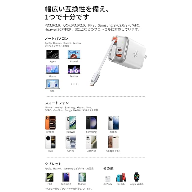 【幅広い互換性があり、1つでこと足りる】:PD3.0/2.0、QC4.0/3.0/2.0、PPS、Samsung SFC2.0/SFC/AFC、Huawei SCP/FCP、BC1.2などのプロトコルに対応。ノートパソコン、タブレット、スマートフォン、Switch、腕時計、ヘッドフォンなど、その他のデバイスにも対応。【3台のデバイスを、同時にフル充電できる】:同時充電時には、インテリジェントに電力が配分されます。単一ポート使用時:USB Type-Cポート:67W、USB Type-Aポート:30W、自動巻き取り式ケーブル:60W(USB-C伸縮式ケーブルは、最大対応60W出力について、これはAppleデバイスを対象とした仕様です。)。