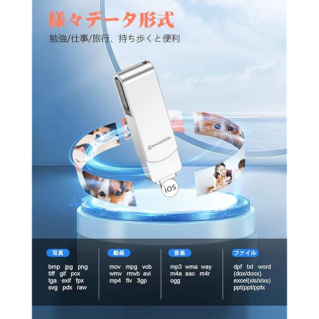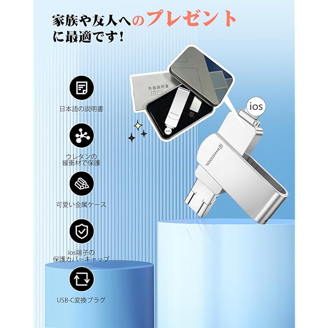 PHICOOL 4in1 USBメモリ 256GB【完全アプリ不要】から直接保存 外付けストレージ ▼3秒で始まるスマート生活 phoneのアルバムを開く→保存したい写真を選択→「USBへ転送」をタップ。 これだけで瞬時にデータ保存!クラウドサービスの月額費もWi-Fi環境も不要。 ▼2024年最新モデル完全対応 └ 16 Pro Max/16シリーズ~ 8まで全世代対応 └pad Pro(M2チップ搭載機種)/MacBook Air 15インチ等最新端末でも安定動作 └Type-C××USB3.0×MicroUSBの4WAY接続 ▼PHICOOLだけの5大革新 軍事級保護:航空アルミニウム合金ケース+内部緩衝材で2m落下耐性 超直感設計:カラー図解マニュアル+動画サポート(日本語専任スタッフ常駐) 潔癖症対応:抗菌加工ライトニングキャップ(99.9%菌繁殖抑制) 完全静音:無駄なLEDランプ廃止で会議中も安心使用 和風美学:桜模様刻印の収納ポーチ付属 ▼こんな方に必需品 ✓「Cloudの課金を解約したい」 ✓「孫の動画でスマホがパンク寸前」 ✓「機種変更時のデータ移行が面倒」 ✓「ビジネスデータの物理バックアップが必要」 ▼仕様詳細 ・転送速度:HD動画1GB約12秒 ・対応形式:HEIC/RAW/MP4/PDF等37種 ・動作環境:-20℃~60℃(雪山旅行でも問題なし) ・サイズ:親指サイズ(5.8×1.4cm) ・重量:ストラップ付きでも3.5g