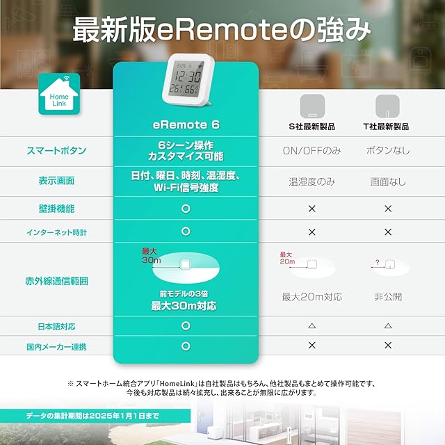 商品名:スマートリモコン ◆国内メーカー 国内サーバー◆ リンクジャパン eRemote6 HomeLink対応 スマートボタン搭載 Alexa対応 スマートホーム 見やすい液晶画面 節電·省エネ エアコン 赤外線対応 遠隔操作 ハブ機能 学習リモコン 高精度温湿度センサー内蔵 国内サポートチーム 【Alexa/Google Home/Siri】