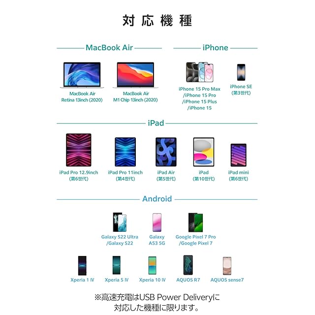 USB Power Delivery、PPS(Programmable Power Supply)に対応しています。iPhoneを約30分で50%まで充電できるから、外出先でスピード充電が可能です。