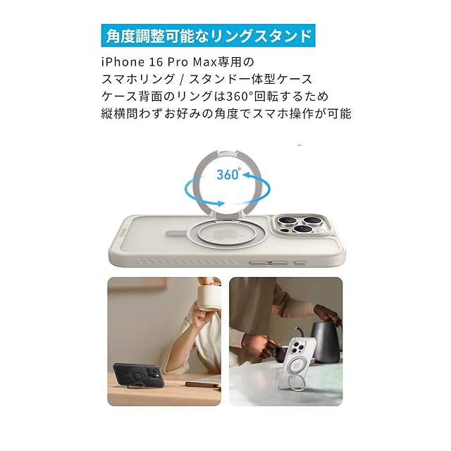 角度調整可能なリングスタンド: iPhone 16 Pro Max 専用スマホリング / スタンド一体型ケース、ケース背面のリングは360°回転するため縦横問わずお好みの角度でスマホ操作が可能です。