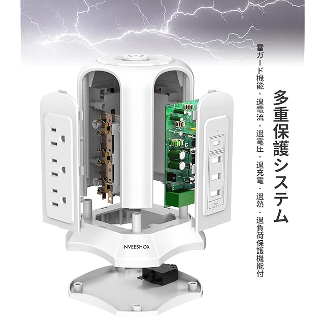 【多重保護システム】このタワー型電源タップは雷ガードを内蔵しており、恐ろしい雷から機器をガードすることに加えて、ブレーカーを内蔵しており、接続している機器の消費電力の合計が1500Wを超えた場合、ブレーカーが作動し電源が切れます。そして、シェル素材は難燃ABS樹脂とPC94V0より作られて、耐火性は750℃に達します。更に過電流、過電圧、過充電、過熱など多重保護を搭載しており、お客様の安全とお使いの家電をお守りできます。