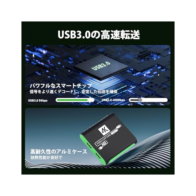 【USB 3.0高速伝送】キャプチャーボード switch対応は、USB 3.0インターフェースを採用し、最大5Gbpsの伝送速度をサポート。録画や配信中の遅延を防ぎ、クリアな画質を実現します。