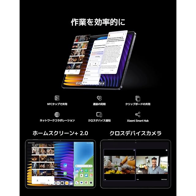 【進化したXiaomi HyperOS 2】Xiaomi HyperOS 2によって強化されたXiaomi HyperConnectは、一新したデザインで直感的な操作体験を提供し、デバイス間の連携をよりシームレスにします。NFCタッチ※共有機能を使えば、デバイスを重ねてタップするだけで瞬時にファイル転送やスマートフォン画面のミラーリングができます。クロスデバイスカメラは、アプリ内でスマートフォンとタブレットのカメラを同時に起動できるため、プレゼンテーションやクリエイティブなワークフローを強化します。