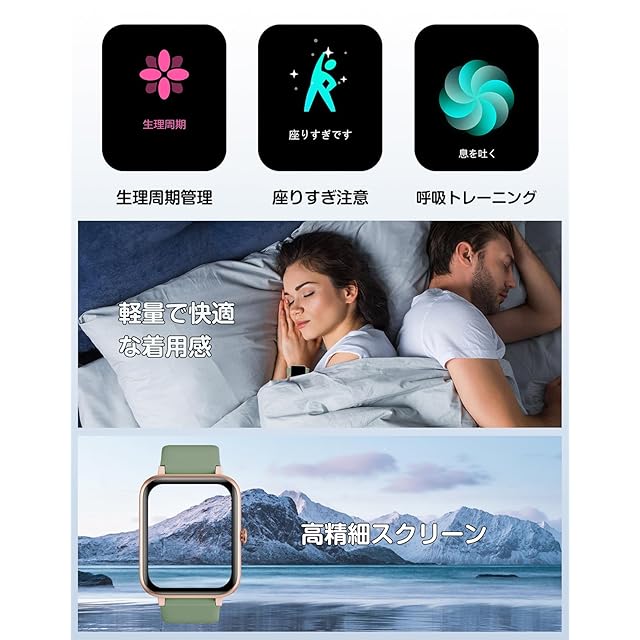 【日常活動記録&1日中快適な装着感】 スマートウォッチを正しく装着すると、歩数、距離などのデータが自動的に記録されます。 シリコンバンドは柔らかく肌に優しく、本体は軽量で着け心地が良いので、1日中データを計測しても問題がありません。自分に歩数目標を設定して、達成するとリマインダーが届くのも面白い体験です。女性に優しい健康機能は前回の記録により、生理期間と排卵期間を予測して、生理期間前のリマインダー可能です。さらに、座りっぱなし注意機能と呼吸トレーニング機能も搭載しています。一緒に良い生活習慣を身につけましょう!
