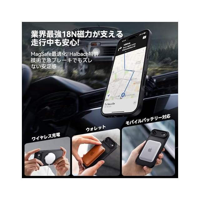 【MagSafe対応を極めた、業界最強18N磁力】 位置合わせ不要、装着した瞬間、車載ホルダーやウォレットなどのMagSafe対応アクセがピタッと吸着。独自のHalbach配列+n58グレード磁石により、業界最強クラス18Nの吸着力を実現、消磁や信号干渉の心配も一切なし。さらに、360°定点回転設計だから、車内での揺れや急ブレーキでもズレず・回らず・傾かない。視線がブレず、運転中のナビ確認も安全そのもの。両面マグネット構造で、冷蔵庫やロッカーにもぴたり。レシピ確認も動画視聴も、完全ハンズフリー革命。※設置面の素材によって磁力が弱まる場合があります。対応機種:iphone Air ケース magsafe対応