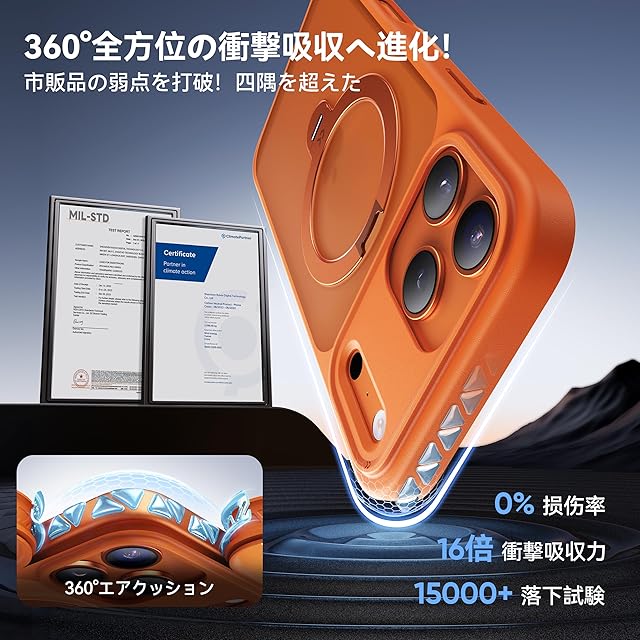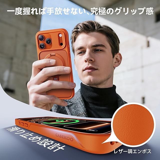 商品名:【2025最高傑作&定点360度回転】CASEKOO iPhone 17 Pro Max 用 ケース MagSafe対応 米軍MIL規格 360°全方向耐衝撃 【横縦両立・角度自由調整】最大25W急速充電対応 指紋防止/マット仕上げ/黄変防止/半透明 ラップホール付き ワイヤレス充電対応 いphone17promax 用ケース 6.9インチ「MagicStand Pro」(オレンジ)