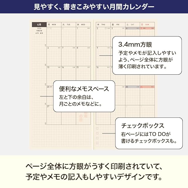 【記入欄】■月間カレンダー/ブロック式、月曜はじまり ■週間予定/レフト式
