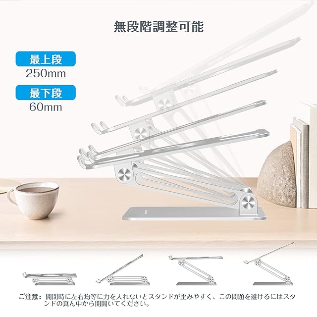 商品名:BoYata ノートパソコンスタンド pc スタンド タブレット 無段階高さ/角度調整可能 姿勢改善 腰痛/猫背解消 安定性 折りたたみ式 アルミ合金製 17インチ以下のデバイスに対応 シルバー