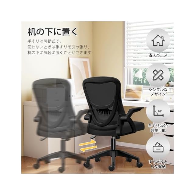 【省スペース!跳ね上げ式アームレスト】このオフィスチェアは、跳ね上げ式のアームレストを備えており、90度回転できるように設計されているため、自由に使用することができます。使わないときはアームレストを引き上げて、どのデ1スクの高さにもすっきりと収納できるので、部屋のスペースを有効に活用できます。部屋、書斎、オフィス、会議室、応接室など幅広く利用されています。