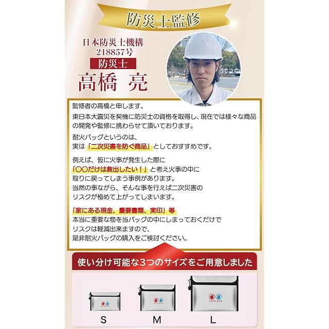 耐火バッグS・M・Lの3サイズセットです。 保管する貴重品のサイズによって、適切に使い分けが可能です。 〈DETAIL〉 ■Sサイズ:20.3cm*12.7cm(重量:70g) 収納例:カード類/小切手/パスポート/貴金属類/現金/印鑑 ■Mサイズ:23.0cm*17.5cm(重量:117g) 収納例:現金/通帳/パスポート/小切手/携帯電話 ■Lサイズ:38.0cm*28.0cm(重量:162g) 収納例:A4書類/ノートPC/タブレット