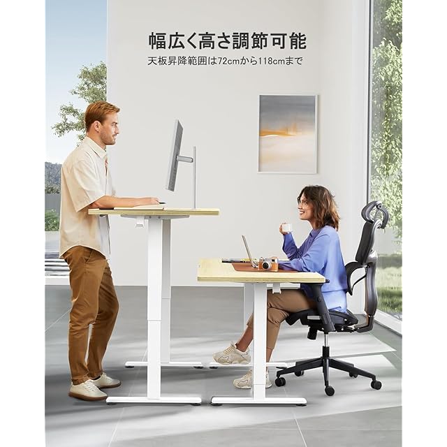 【立ち・座りがこの1台で切り替え!】ErGear昇降式デスクは無段階に高さ72~118cmまで稼働することができます。子供から大人まで、身長や姿勢に合わせて設定できます。また、高さを3ヶ所まで保存できるメモリー機能付きで、ワンタッチでお好みの高さまで調整できます。テレワークや座り作業がきつい方にお勧めいたします。