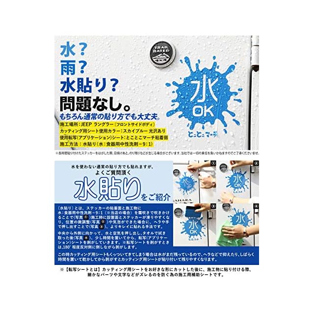 施工時、貼り付け、貼りはがしの際に発生するキズ、破損等につきましては当社では一切の責任を負いかねます。また、貼り付けたステッカーをはがした際に、日焼けあと、のり残りが生じる場合がありますが、当社では一切の責任を負いかねます。予めご了承ください。