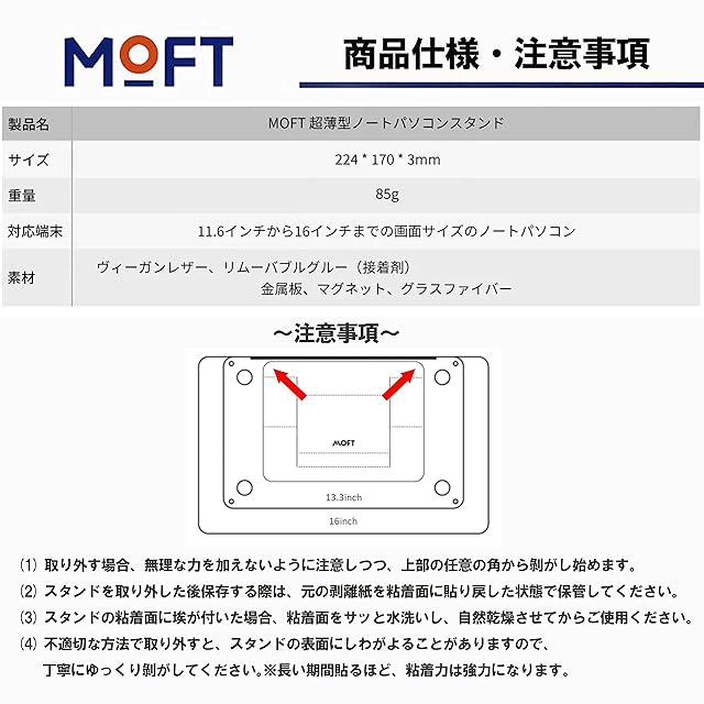 【取り外し簡単】 本品は繰り返し接着可能なリムーバブルグルーを採用するため、場合による貼りながら調整することや、剥がしてまた貼ることも、思いのままにできます!ご注意:取り外す場合、無理な力を加えないよう、上部の任意の角から剥がし始めてください。また、スタンドの粘着面に埃がついた場合は粘着面を水洗いし、自然乾燥させてからご使用ください。※注意点:Apple製のMacBook AirやMacBook Proはもちろん、DELLやMicrosoft、その他様々なノートPCに適合しますが、貼り付け面が凸凹している機種には使用することができませんので、ご注意ください。