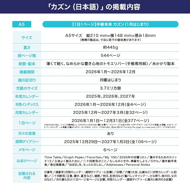 【記入欄】1日ページ/年間カレンダー/年間インデックス/月間カレンダー/週間カレンダー