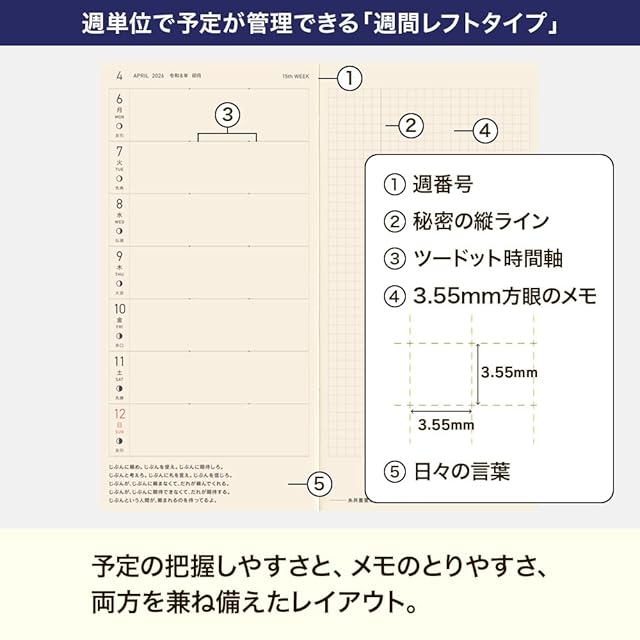【記入欄】■月間カレンダー/ブロック式、月曜はじまり ■週間予定/レフト式