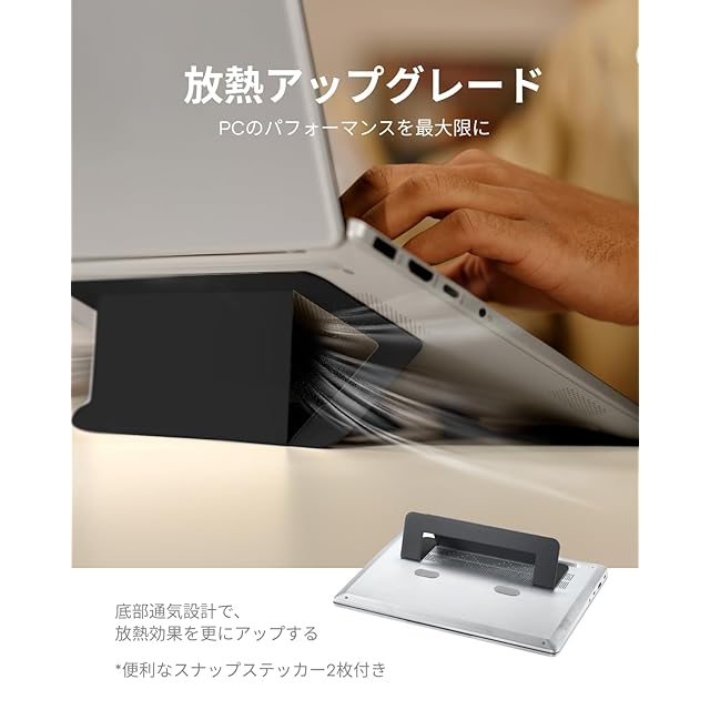【シンプルで効率的・変わらぬサポート】特殊なPU素材を使用し、思い通りに動く折りたたみ式デザインを採用し、軽量・小型・薄型でありながら、最大耐荷重5kgの日常使いのできるパソコンスタンドです。 *ご注意:パソコンスタンドをご使用の際、キーボードの周りを叩くとパソコンが揺れるという意見を頂きました。この件について、実際に使用した場合を検討し、作業時両手を自然にキーボード上に置くと揺れることはないのでご安心ください。