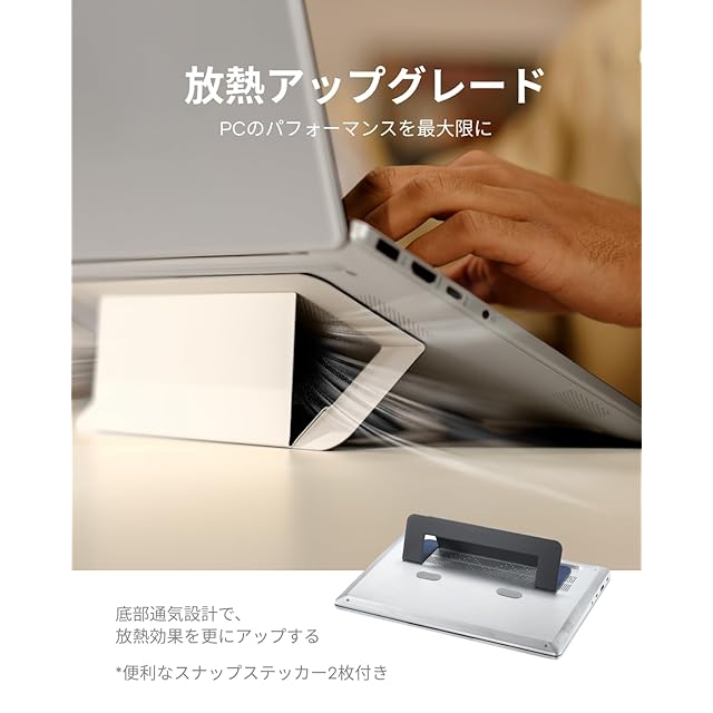 【驚きの軽さ· ミニマリズムへのこだわり】重さわずか65g,サイズは約224*135*2.5mm。AirFlow Standは薄さ・軽さの限界に挑み、レギュラーサイズを20%削減し、25%以上の軽量化を実現した製品です。 さらに、収納時はスタンドをしっかり固定できるように、スナップシール2枚付属しており、まさに見えない収納を実現しています。
