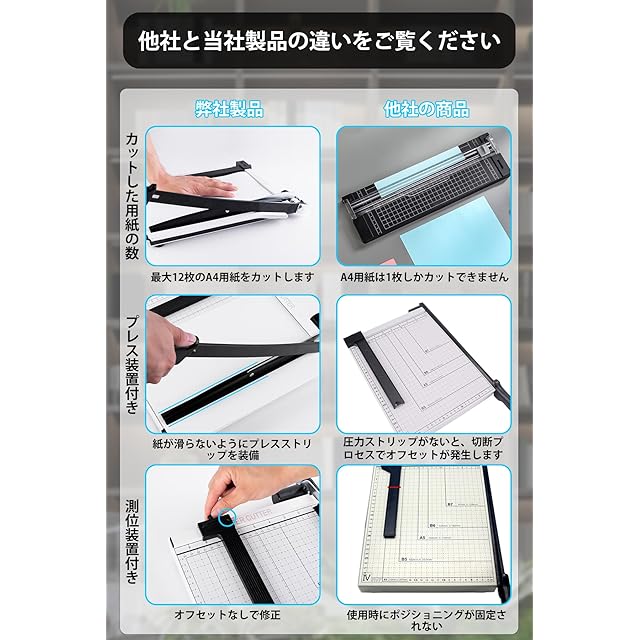 【プレミアム素材、シャープなカット】裁断機高品質のスチール製、高品質、シャープなエッジ、カットしやすい紙、最大12枚までカットできます。 テキスタイル、プラスチック、テキスタイル、写真、段ボールなどもカットできます。 オフィスでの使用に最適です。