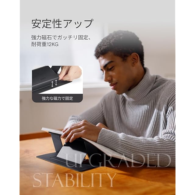 『抜群の安定感と耐久性』さらに進化したMOFTパソコンスタンドは、独自開発のヴィーガンレザー「MOVAS」を採用し、高級感あふれる手触りと耐久性を両立。耐荷重はなんと12kg!アップグレードした表面のポリウレタン(PU)は劣化しにくく、高い防滑性と耐荷性を兼ね備えています。また15°モードではマグネット吸着機能を追加し、ワンタッチでしっかりデバイスを取り付けることが可能です。