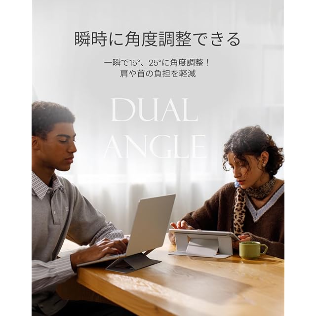 『2段階角度調整、簡単に切り替え』15°と25°の2段階角度調整で、あなたにぴったりの姿勢に。画面の高さを8cmまで上げられるので、猫背防止に役立ち、長時間作業による疲労を軽減します。取り付けが簡単、角度調整もスムーズで、1秒で作業モードに切り替えられ、快適な作業環境を整えられます。