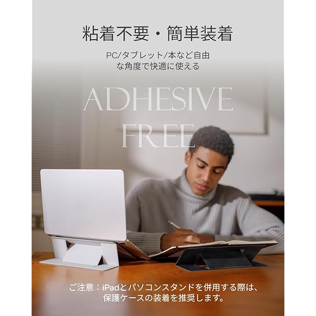 『非粘着タイプ、一台でマルチに活躍』ノートパソコンだけでなく、タブレット、本など、様々なデバイスに対応可能です。ノートパソコンに貼り付ける必要がなく、デバイスを傷つける心配もありません。一台でマルチに活躍するMOFTノートpcスタンドは、あなたのデジタルライフをより豊かにします。(ご注意:iPadとパソコンスタンドを併用する際、保護ケースの装着を推奨します。)