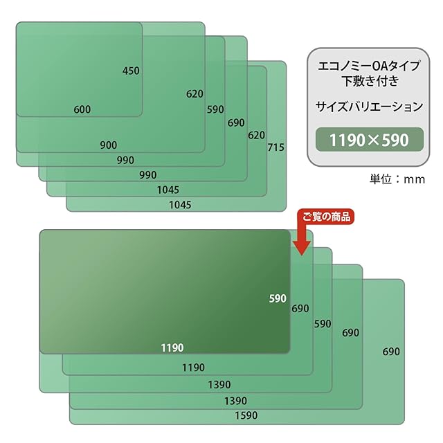 商品名:プラス デスクマット マウス対応 下敷付 エコノミータイプ サイズ 多数 マット めくれにくい インクが移りにくい 1.9㎜厚 薄手 1190×590㎜ 透明+グリーン DM-126EW 41-026