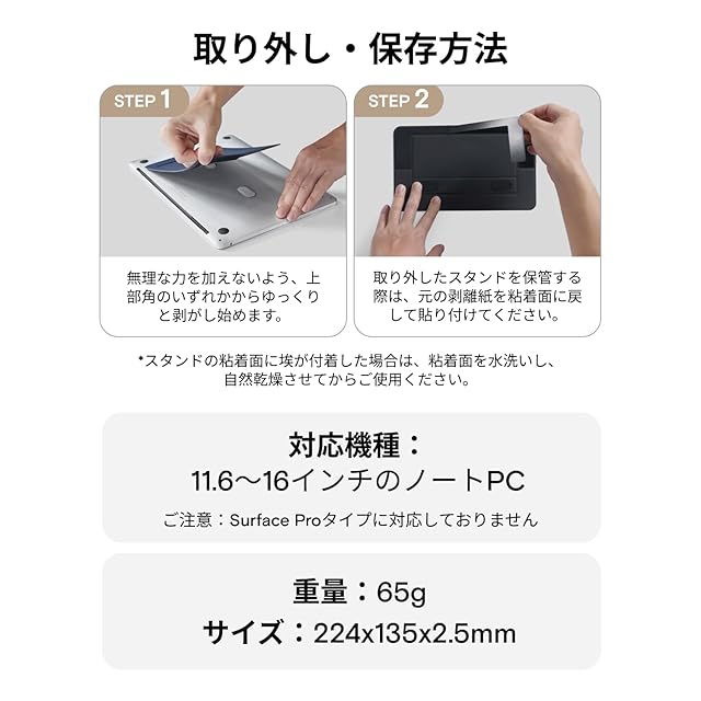 【驚きの軽さ· ミニマリズムへのこだわり】重さわずか65g,サイズは約224*135*2.5mm。AirFlow Standは薄さ・軽さの限界に挑み、レギュラーサイズを20%削減し、25%以上の軽量化を実現した製品です。 さらに、収納時はスタンドをしっかり固定できるように、スナップシール2枚付属しており、まさに見えない収納を実現しています。
