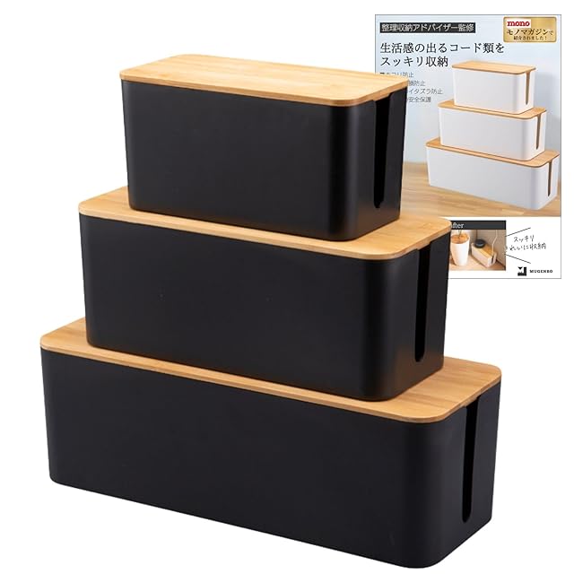 【monoマガジン掲載・整理収納アドバイザー監修】ケーブルボックス 配線隠し ケーブル 収納 コード 収納 コンセントボックス 配線ボックス コンセント収納 コードケース 配線 ケーブル隠し コードボックス mugenbo (ブラック木目3個セット)