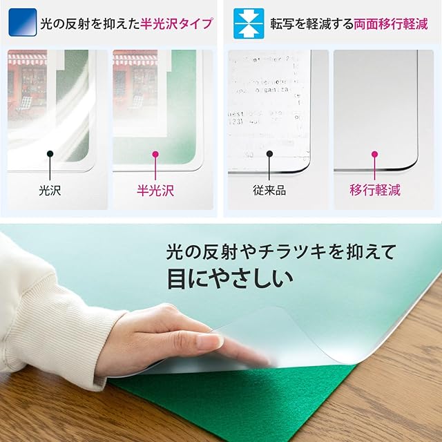 シボ入り「ノングレア」(反射抑制、半光沢) / 材質:マット=40%再生樹脂、軟質ポリ塩化ビニル(PVC)1.2mm厚、下敷=70%再生不織布(PET)0.7mm厚
