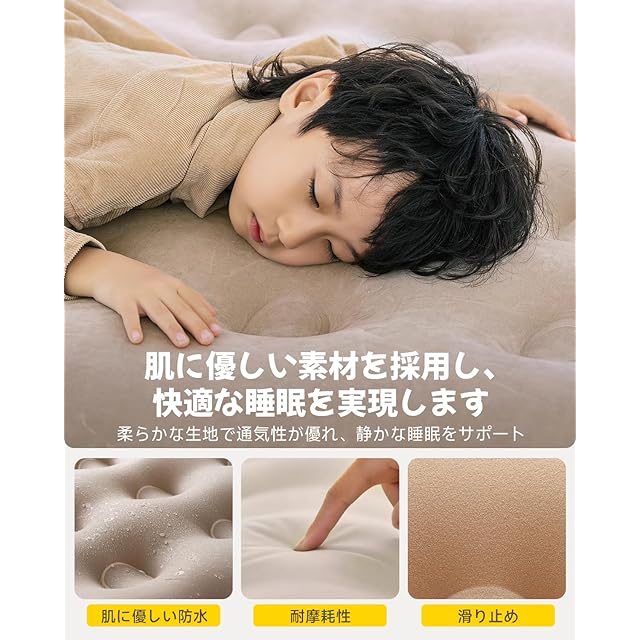 【究極の耐久性と快適性 - 32孔蜂巢式デザイン】 このエアベッドは32孔蜂巢式デザインを採用し、複数のポイントでサポートを提供し、圧力を効果的に分散させ、構造の安定性を保っています。人間工学に基づいたデザインで、快適な枕が付属し、体の自然な曲線にぴったりフィットして、質の高い睡眠を提供します。底面には強靭なPVC素材を使用し、穿孔や変形を防ぎ、長期間使用しても耐久性を保ちます。また、底面と側面には防水機能が施されており、汚れも簡単に拭き取れ、手入れが簡単です。表面は柔らかいベルベット素材を使用しており、優れた防水性と通気性を備え、快適さと実用性を兼ね備えています。