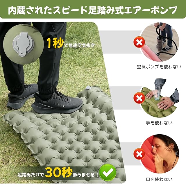 【30秒で素早く膨らむ・足踏み式】このエアーベッドはポンプや空気充填機を単独で購入する必要はありません。足部には足踏み式エアポンプが内蔵されており、電動エアポンプ、手動エアポンプ、吹き付けなどの従来の空気充填方式とは異なり、30〜60秒でキャンプ用マットが完全に膨らみます。空気の放出はわずか1秒で簡単に行え、撤収もストレスフリー。さらに、アップグレードされたダブルバルブ設計により、空気漏れの心配もなく、夜中にマットがへたる心配はありません。