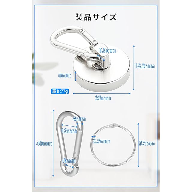 【商品仕様】カラビナ磁石×6、鉄のリング×6。マグネットフックサイズ:直径36mm、高さ18.5mm、マグネット厚さ8mm、重量77g、垂直荷重50kg。 素材: ネオジム磁石、強力磁石。