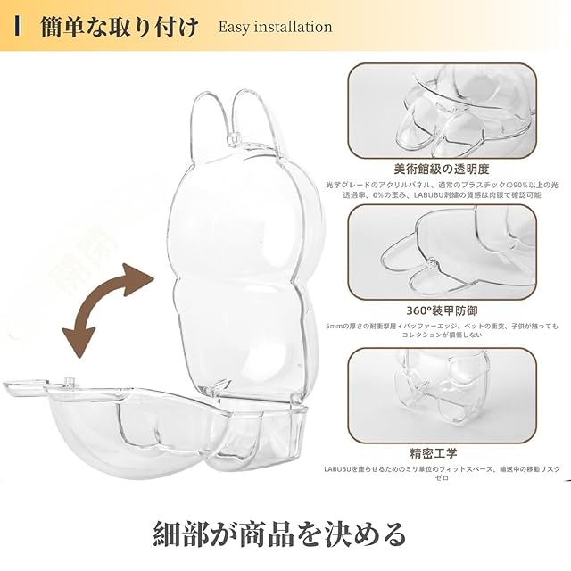 互換性があるLABUBUぬいぐるみ用透明保護ケース:この透明収納ボックスは、Labubuぬいぐるみを埃や汚れから守り、清潔に保ちます。360°全方位保護 - 強化されたエッジと完璧なフィット感で、衝撃、傷、環境ダメージに効果的に耐性します。ご自宅や屋外でのディスプレイに最適です