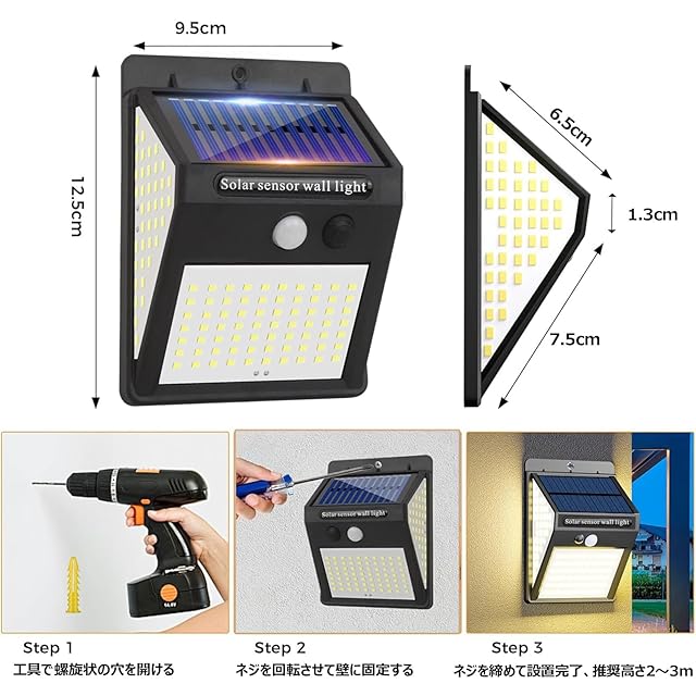 【高輝度150LED・3面発光・300°照明】屋外防水ソーラーライトは150個高品質LEDが揃え、発光効率の高い上に、3面発光で照明角度が300°以上に達します。色温度は6500K、昼光色で昼のように所々を照す。発熱が少なく、低赤外線・低紫外線で虫を寄せ付けにくい。人感センサーライトの検出角度が160°になったので、ほぼすべての角度から不審者や犯罪者を威嚇できます。屋外に設置して防犯対策効果が抜群です。(設置前に、できるだけ日当たりの良い場所を選んでください)